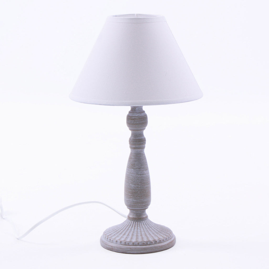 Lampada da tavolo in metallo grigio anticato e cupola bianca in tessuto. Utilizzabile come abatjour o in ogni ambiente di casa. Shabby chic.