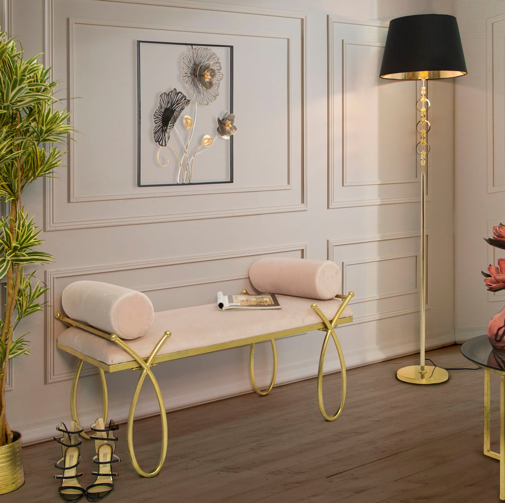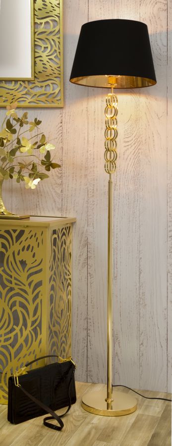 Piantana in metallo dorato con paralume in tessuto nero dal design geometrico e ipnotico. Lo stile glam combina dettagli chic e stravaganti. Lampade da tavolo e da terra che si fanno notare per l'abbinamento tra l'oro e colori accesi o colori più dark come l'ardesia e il nero.