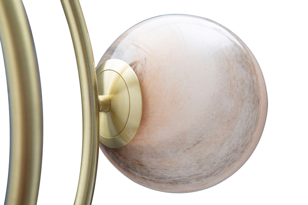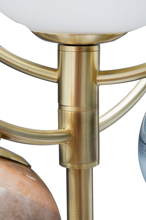 Piantana 7 punti luce in metallo dorato con sfere in vetro opaco che diffondono una luce delicata e soffusa. Stupende lampade che riproducono il sistema solare. Un tocco di astronomia glam e moderno nella tua casa.