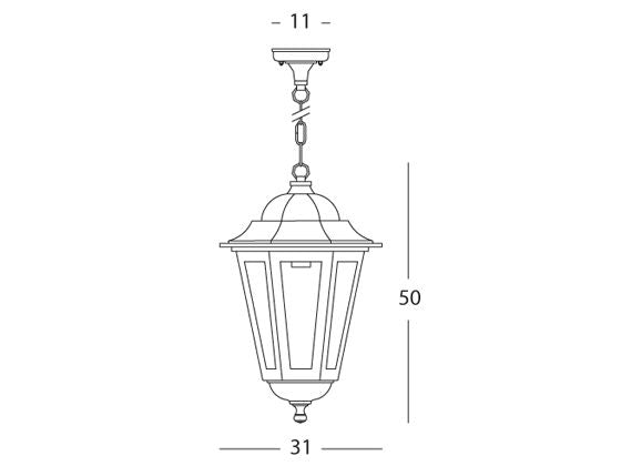 Lampada lanterna sospesa colore nero per esterno linea maxi esagonale. Struttura completamente in pressofusione di alluminio. Trattamento anticorrosivo con Verniciatura a polveri epossidiche. Diffusori in vetro in lastra trasparente, già montati. Sospensione con Contro-base di fissaggio a parete in termoplastico ad alta resistenza. Cavo di alimentazione H05RN-F 3G1 mmq ed accessori per il fissaggio. Viteria in ottone. Portalampada in porcellana con attacco E27. Copri-portalampada di alluminio in tinta. Adatta per lampade ad incandescenza e risparmio energetico. Lampada esclusa. Alimentazione 230V ~ 50Hz. Classe di protezione: IP43 Potenza massima lampade: 100W