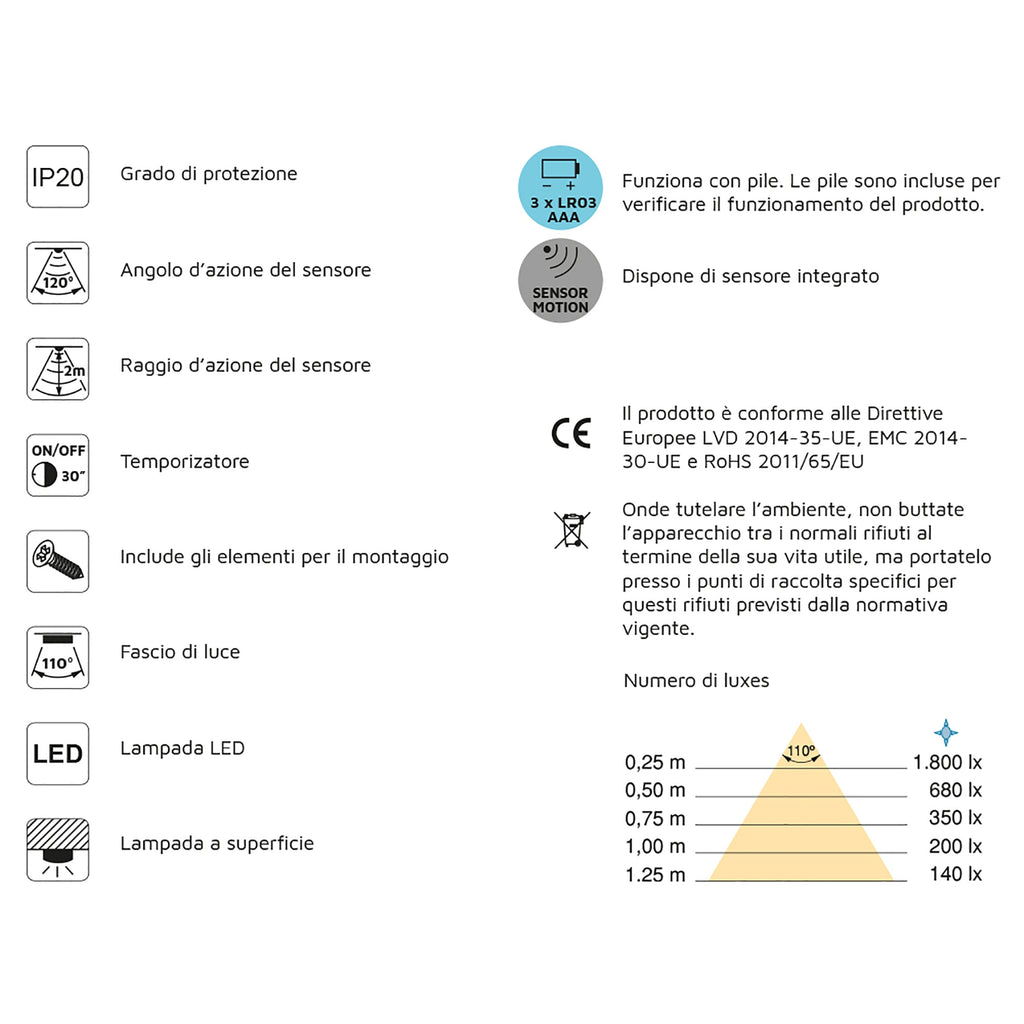 L'illuminazione LED Phoenix con funzionamento a batterie e sensore di movimento integrato, ideale per armadi e mobili situati in luoghi dove non c'è l'installazione elettrica. È progettata per il montaggio a superficie, con una base di fissaggio che permette di orientare il fascio di luce 120° grazia il suo meccanismo rotatorio. Dispone di un sensore di movimento integrato, con un campo di rilevamento di 2 metri di lunghezza in un angolo di 120°, che mantiene accesa l'illuminazioone mentre rileleva il movimento e si spegne trascorsi 30 secondi dall'ultimo movimento rilevato. Quest'illuminazione possiede una tecnologia LED a basso consumo e una temperature di colore bianco freddo, inoltre ha una potenza di 0,60 W e un fascio luminoso di 30 lumen. Include 3 pile tipo LR03 (AAA) e un interruttore a tre posizioni accesa, spenta, o accensione tramite sensore.