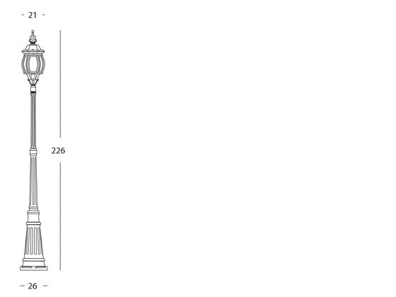 Lampada palo alto per giardino colore grigio per esterno linea maxi molata. Struttura completamente in pressofusione di alluminio. Trattamento anticorrosivo con Verniciatura a polveri epossidiche. Diffusori in vetro stampato molato e curvato, già montati. Dima per il fissaggio a terra e bulloneria in acciaio inox. Cavo interno di alimentazione e dispositivo stagno di connessione. Viteria in ottone ed utensili per il serraggio. Portalampada in porcellana con attacco E27. Copri-portalampada di alluminio in tinta. adatto per lampade ad incandescenza e risparmio energetico. Lampada esclusa. Alimentazione 230V ~ 50Hz. Classe di protezione: IP43 Potenza massima lampade: 100W