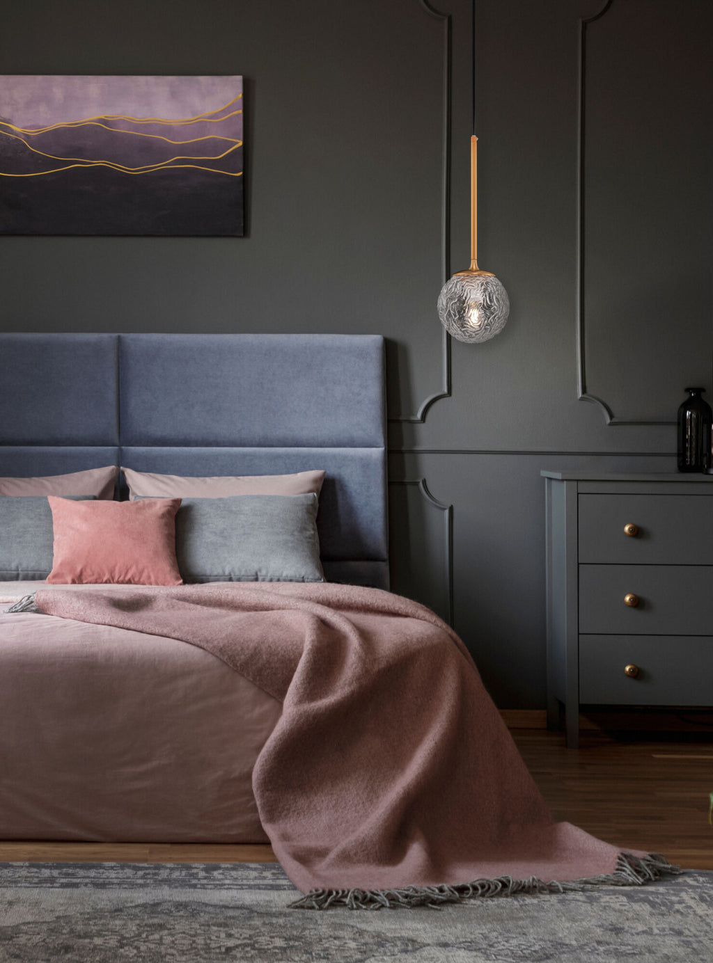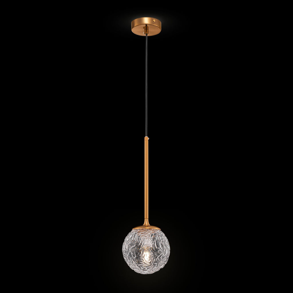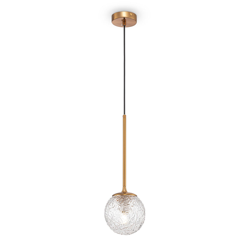 I diffusori in vetro trasparente con effetto "moirè". La struttura in colore ottone e cromo. L'altezza delle lampade a sospensione è regolabile dalla lunghezza della fune.