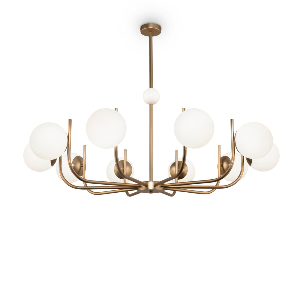Il disegno della lampada si basa sull'alterazione delle forme semplici con gli elementi stondati. La struttura di colore ottone, i diffusori in vetro opaco color bianco.