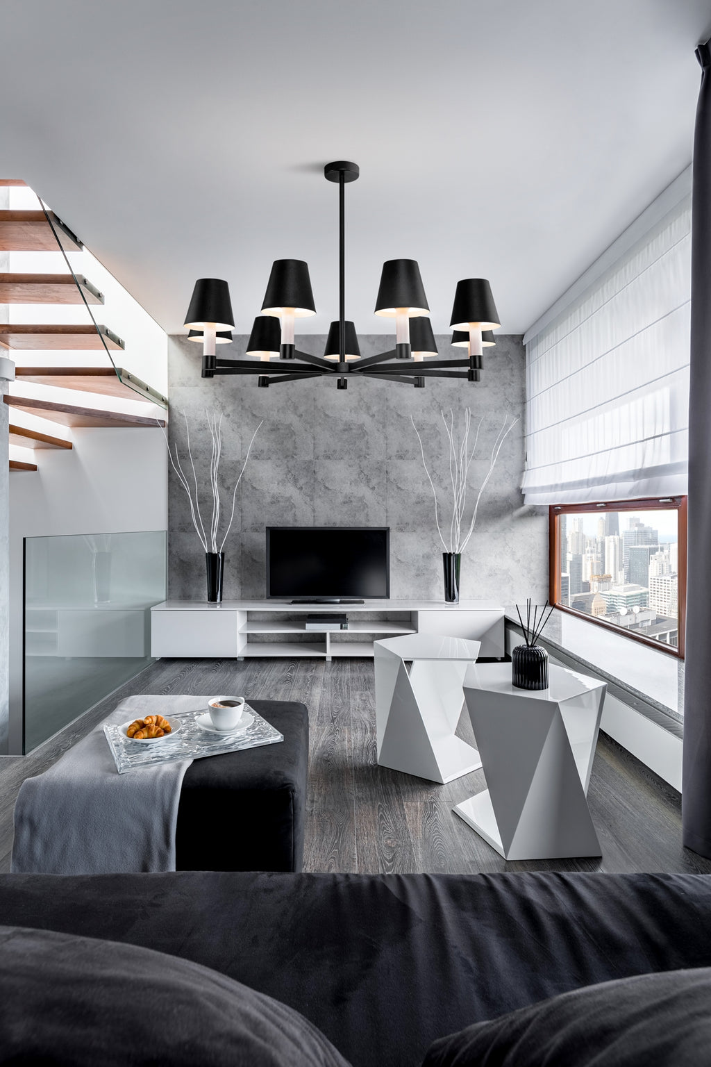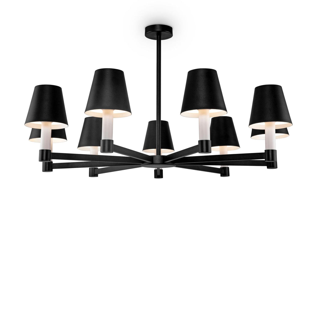 La struttura in Metallolo nero. I diffusori in Metallolo nero. La serie comprende le applique e plafoniere a 5, 7, 9 luci.