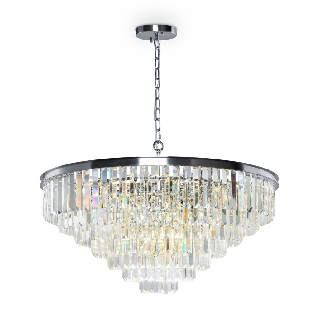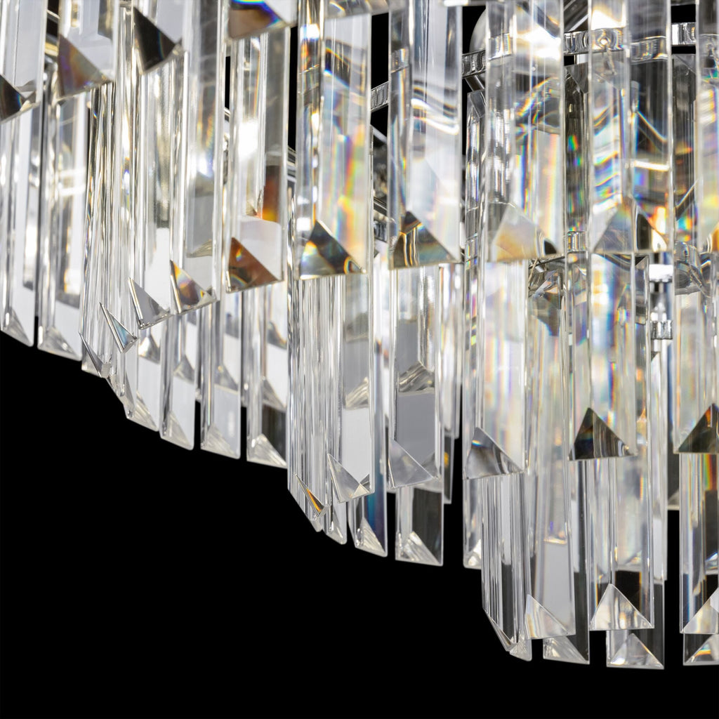 Elementi in cristallo a sospensione a piani multipli. La struttura in Metallolo è verniciata in color cromo o ottone. L'altezza delle lampade è regolabile