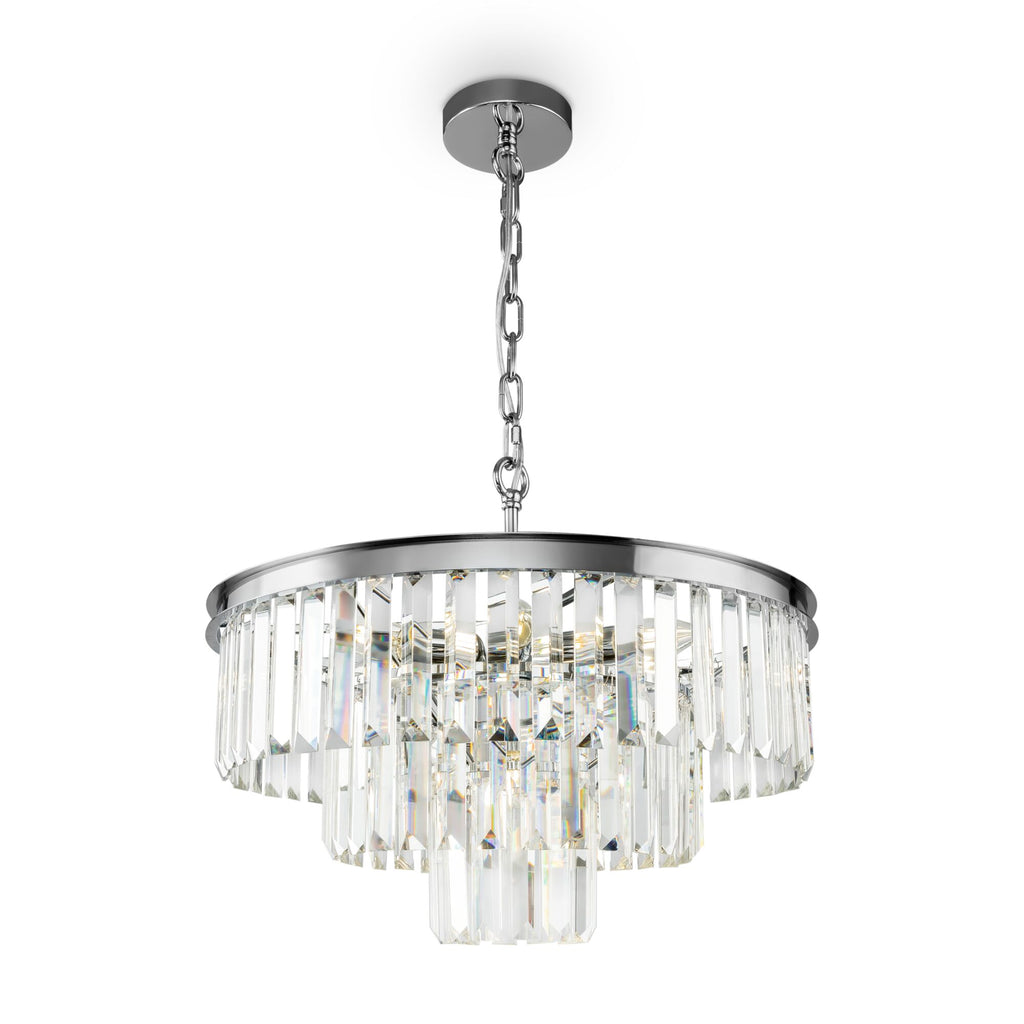 Elementi in cristallo a sospensione a piani multipli. La struttura in Metallolo è verniciata in color cromo o ottone. L'altezza delle lampade è regolabile