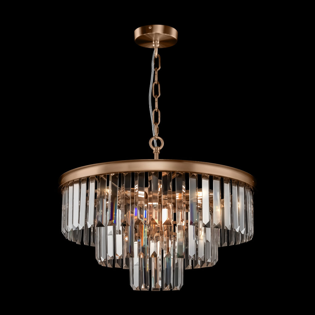 Elementi in cristallo a sospensione a piani multipli. La struttura in Metallolo è verniciata in color cromo o ottone. L'altezza delle lampade è regolabile