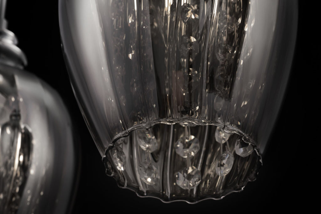 Struttura in Metallolo, diffusori in vetro trasparente (MOD044) o fumé (MOD033). Pendenti decorativi in cristallo.