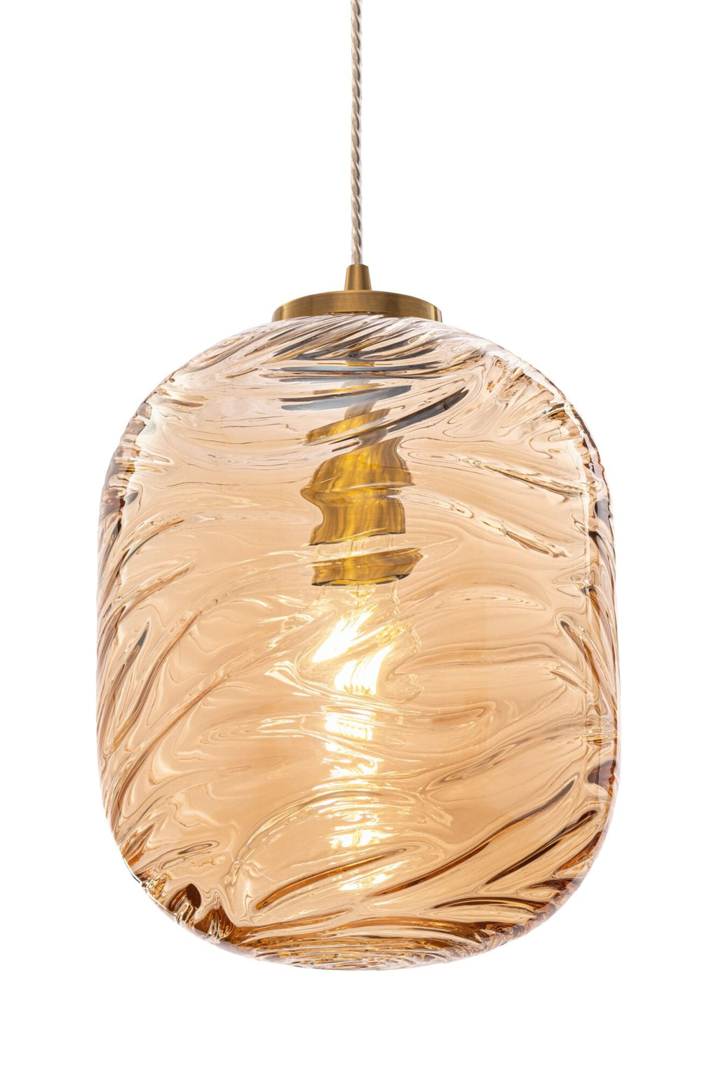 I diffusori in vetro colore opalino, trasparente e ambrato, con le linee ondulate tenere sulla superficie. L'altezza delle lampade è regolabile dalla lunghezza della fune.