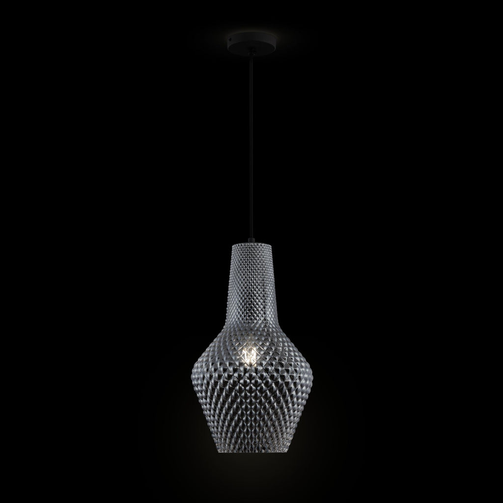 La superficie rigata dei diffusori in vetro soffiato. La struttura è realizzata in Metallolo. L'altezza delle lampade è regolabile dalla lunghezza del filo.