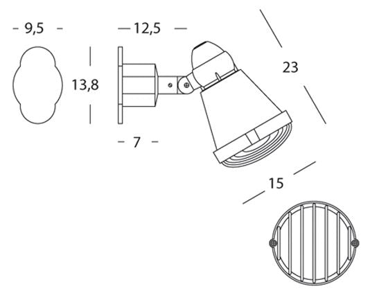 Lampada spot con griglia orientabile colore alluminio per esterno linea city. Struttura completamente in pressofusione di alluminio. Trattamento anticorrosivo con Verniciatura a polveri epossidiche. Diffusore in vetro trasparente con griglia di protezione. Parabola riflettente in alluminio. Pressacavo di entrata PG9. Guarnizione siliconica e viti in acciaio inox. Faretto con controbase ed accessori per il fissaggio. Picchetto con Cavo di alimentazione mt 2 H05RN-F 3G1 mmq completo di spina schuko. Portalampada in porcellana con attacco E27. Sdatto per lampade a risparmio energetico, incandescenza e PAR 38. Lampada esclusa. Alimentazione 230V ~ 50Hz. Classe di protezione: IP54 Potenza massima lampade: 80W