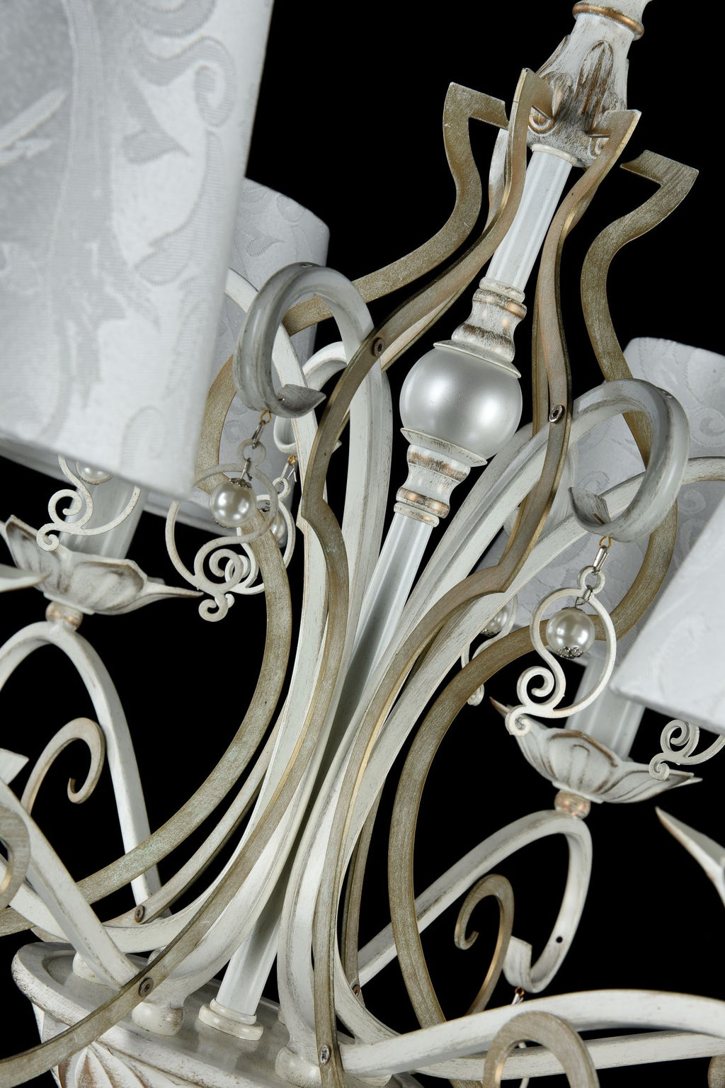 Struttura in Metallolo, finitura in bianco e oro. Perle decorative e paralumi fantasia.