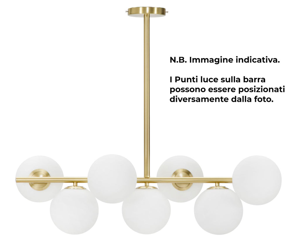 Lampadario con 7 punti luce in metallo dorato con sfere in vetro bianco. Le particolari linee si sposano alla perfezione con l'eleganza dell'oro per creare un design unico.