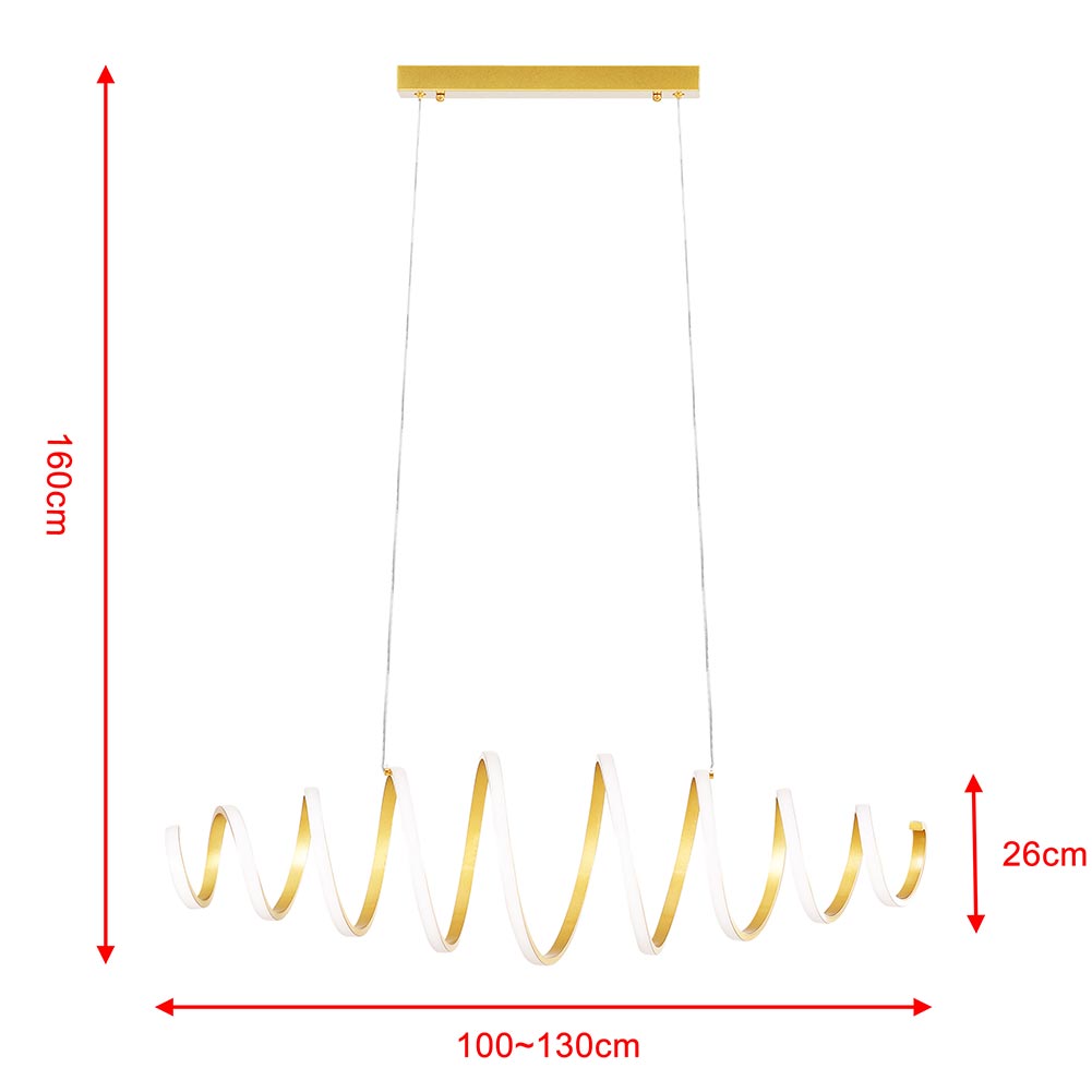 Questo bellissimo lampadario è realizzato con una solida struttura a forma di spirale realizzati interamente in alluminio satinato di altissima qualità iun un elegantissimo colore oro, lungo la struttura è installata una lunga striscia LED che vantano di una superficie di illuminazione totale di ben 3600 lumen di pura potenza illuminante garantiti da un chip LED che producono una luce ad altissima luminosità , con un consumo di soli 58W.
