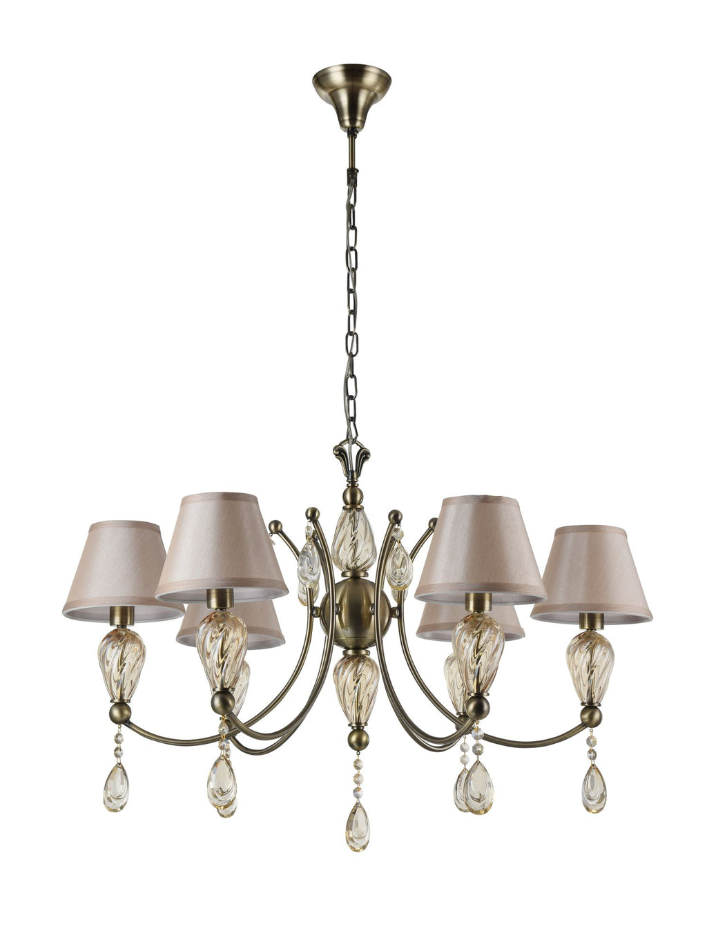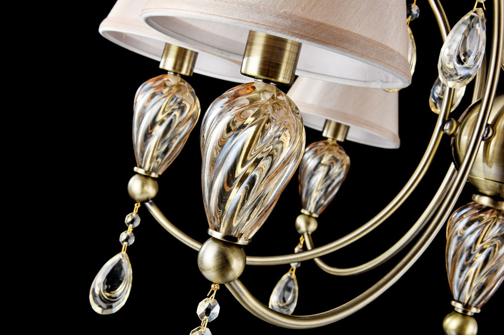 Struttura in Metallolo, finitura in bronzo. Componenti e pendenti in cristallo color champagne.