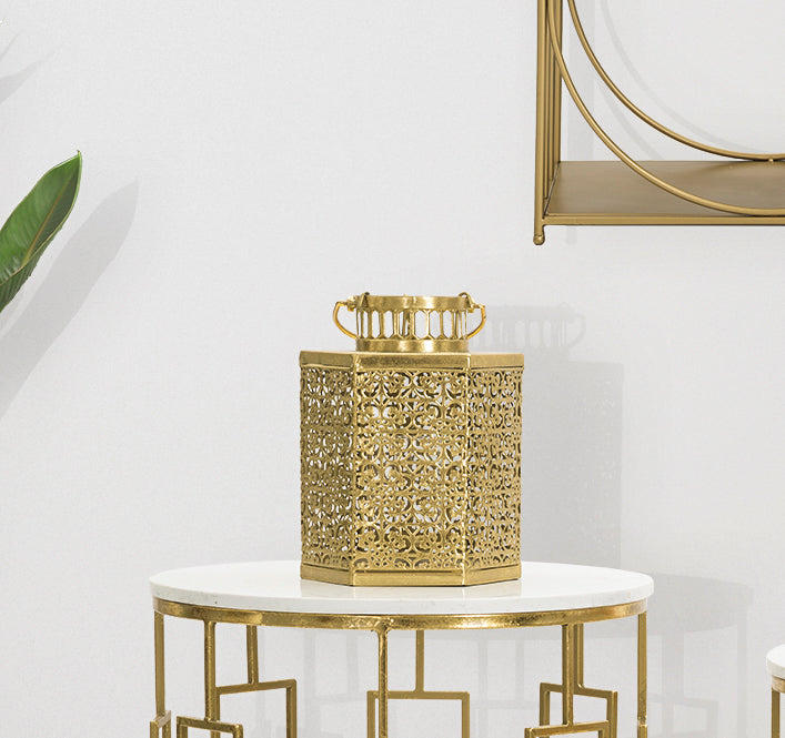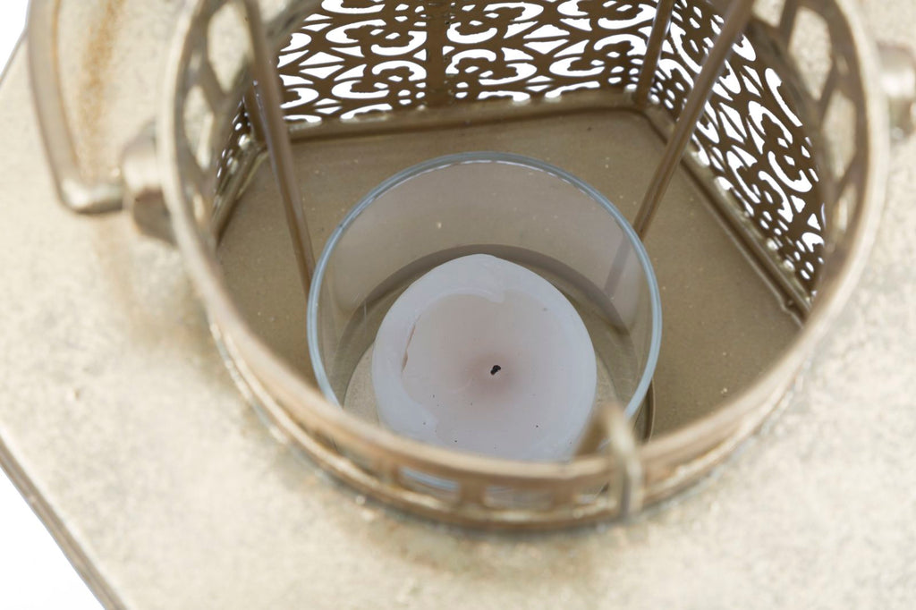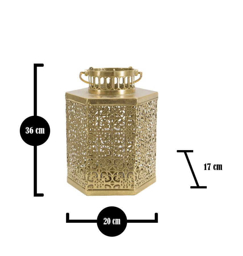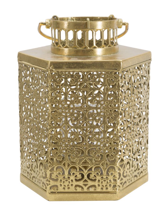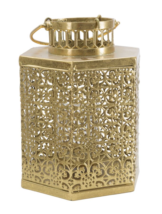 Elegante lanterna con manico in metallo dorato. I particolari intagli, illuminati da una candela rendono magico ogni ambiente.
