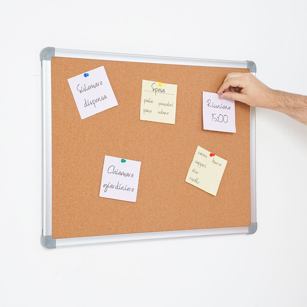 La lavagna da parete è realizzata in alluminio anodizzato silver, conferendole un aspetto elegante e resistente. Gli angoli di protezione in ABS garantiscono una maggiore durata nel tempo. La superficie della lavagna è realizzata in sughero naturale spesso 2mm, ideale per l'utilizzo di puntine ferma fogli. La lavagna può essere posizionata sia in verticale che in orizzontale e include un kit per il fissaggio a muro. Le dimensioni della lavagna sono di 60x45 cm, offrendo uno spazio ampio per scrivere e appuntare documenti.