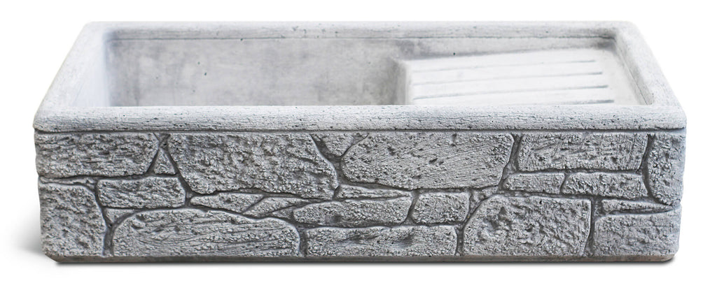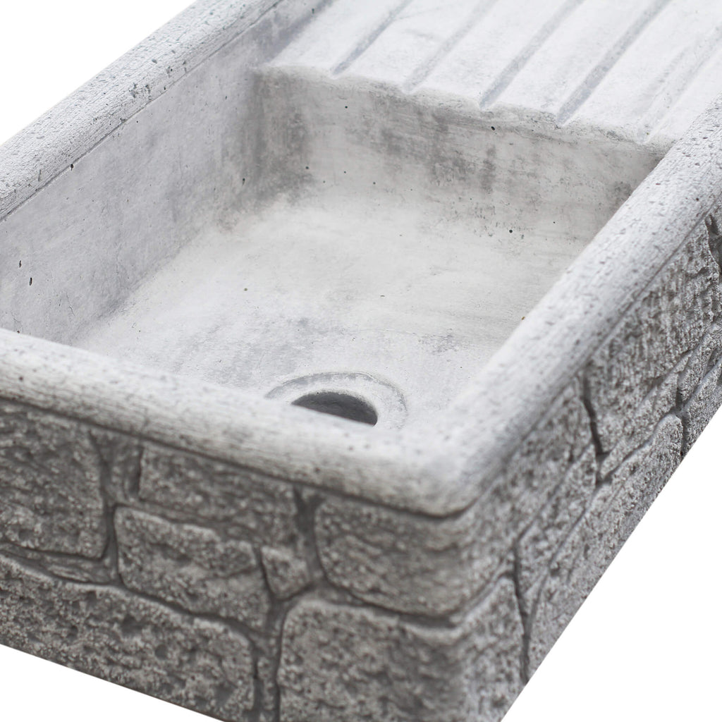 Lavandino in cemento con sgocciolatoio e presenta una texture rustica tipo sasso. Realizzato in cemento bianco e granuto di marmo, anticatura grigio. Tutte le quattro pareti laterali del lavandino sono rifinite. E' quindi possibile orientare vasca e sgocciolatoio in base alle necessitè. Prodotto 100% Made in Italy