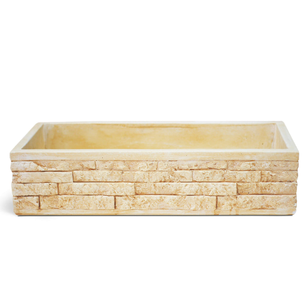 Lavandino in cemento Il lavello in pietra ricostruita per giardino, Modello Meseta XL, è resistente e leggero. Infatti pesa solo 32 kg. Realizzato in cemento bianco e granuto di marmo, anticatura nocciola.