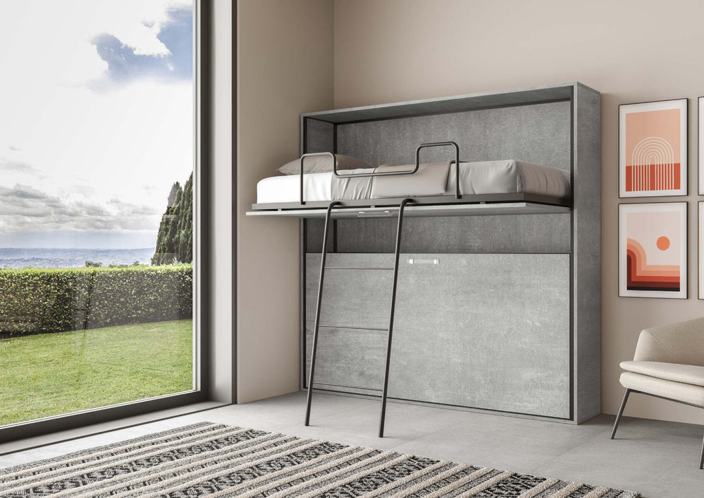 Letto a scomparsa Kando doppio. Letto Kando in versione doppia, composto da due letti singoli a castello a scomparsa. Un modello dalla estrema praticità che consente di usufruire appieno di ogni singolo centimetro di superficie a propria disposizione. Due letti singoli che permettono un riposo e un relax di primo livello, occupando solamente poco spazio a terra. Il letto può essere aperto separatamente, solamente nella soluzione inferiore, superiore, o in entrambe contemporaneamente. La rete del letto inferiore è dotata di piedini estraibili che ne consentono l'appoggio a terra, mentre per il letto superiore viene fornita una scaletta. Il letto rimane stabile e robusto grazie ad un meccanismo di sicurezza interno che ne assicura la rigidità. Struttura della rete in ferro rinforzato verniciato a polvere epossidica colore alluminio goffrato. Pannelli in microparticelle di legno da 18 mm. Movimento della discesa e della salita verticale. Le 2 cinghie permettono di tenere ben saldo il materasso in posizione verticale. La rete a doghe è compresa. Materassi non compresi. Importante nota sul montaggio: il montaggio del letto Kando prevede una difficoltà elevata e necessita di due persone esperte per eseguirlo.