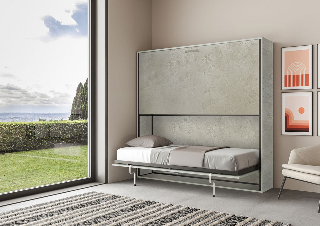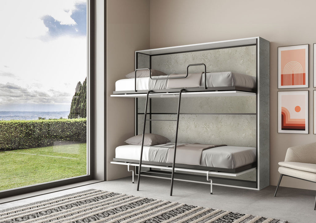 Letto a scomparsa orizzontale Kando versione con due letti singoli a castello. Una soluzione salvaspazio pratica e originale che consente di sfruttare al meglio ogni singolo centimetro di superficie, permettendo la possibilità di trasformare in poche mosse e semplici mosse una zona giorno in zona notte. Ideale anche per chi ha a disposizione spazi ridotti. Quando chiuso occupa relativamente poco spazio, quando aperto offre lo stesso comfort e lo stesso riposo di un normale letto singolo. Struttura del letto realizzata con pannelli di particelle di legno nobilitato sp.18 mm. Struttura della rete in ferro rinforzato verniciato a polvere epossidica colore alluminio goffrato. Il meccanismo di apertura è provvisto di un sistema anti-chiusura con bloccaggio di sicurezza con maniglie di sgancio laterali. Incluso di rete ortopediche realizzate in doghe di legno lamellare da 85x190 cm con cinghie ferma materasso. Materassi da cm 85x185 H.14 inclusi. Il letto rimane stabile grazie ad un meccanismo di sicurezza interno che ne assicura la rigidità. Il letto può essere aperto a propria necessità, solo il letto superiore, solo il letto inferiore o entrambi contemporaneamente. Il letto inferiore è dotato di piedini estraibili che consentono alla rete inferiore di poggiare a terra in tutta sicurezza, mentre il letto superiore è dotato di pratiche scalette per scendere o salire. La discesa dei letti è agevolata dalle maniglie incluse.