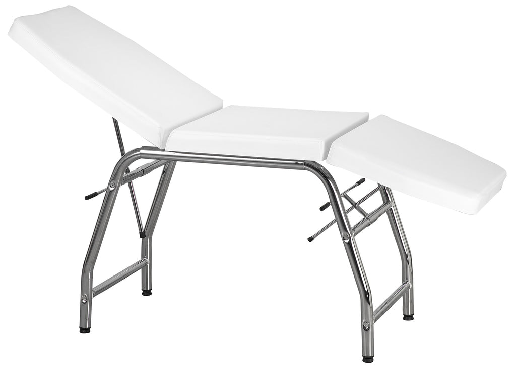 Lettino da massaggio Fisso "LUX 2" con struttura in tubo d'acciaio cromato. Testata e pediera regolabile con sistema autobloccante. Rivestimento di serie in skai bianco.