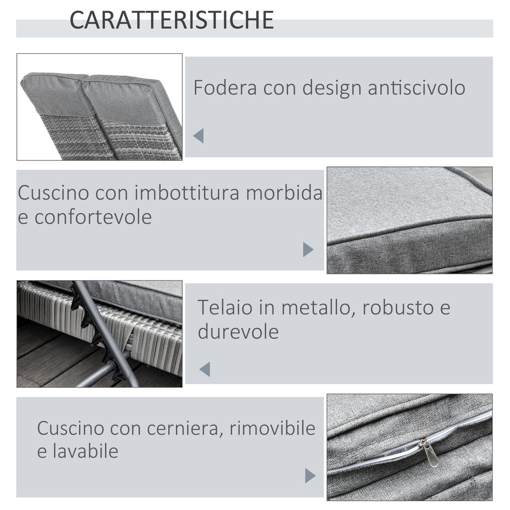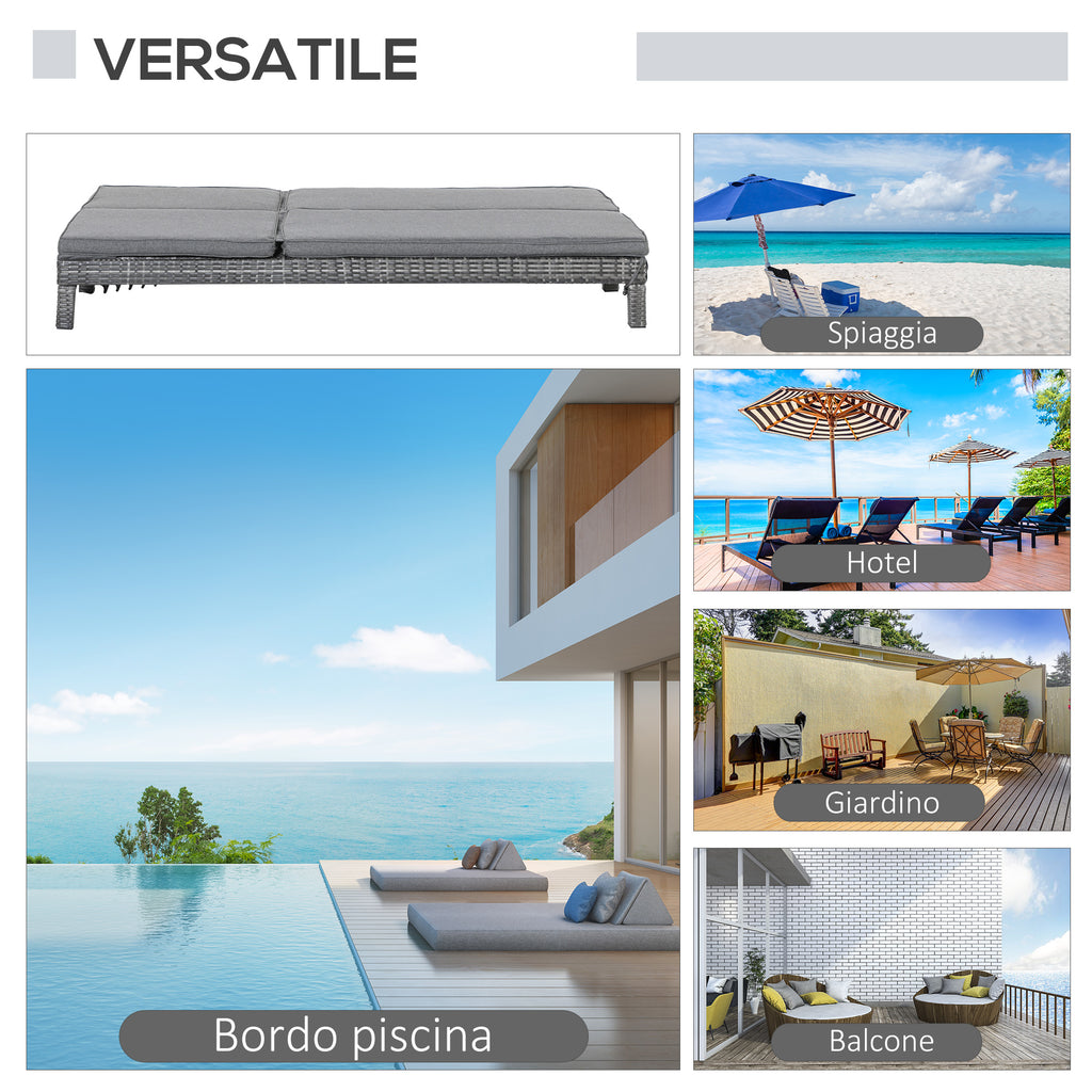 Prendi il sole sul tuo nuovo lettino a 2 posti. Realizzato in acciaio e vimini sintetico, è un prodotto estremamente stabile e resistente. Il comfort è assicurato grazie ai 2 materassini imbottiti e allo schienale regolabile 5 livelli di altezza. Il colore grigio è delicato e raffinato: perfetto per portare un tocco di eleganza nel tuo ambiente.