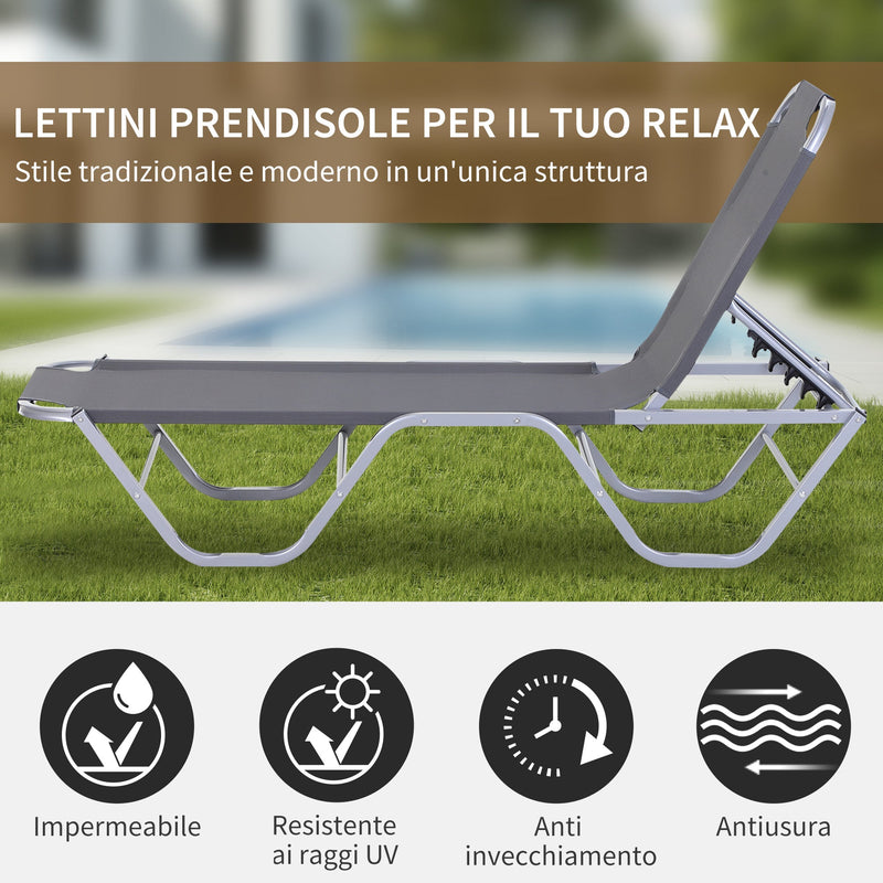 Il modo più semplice per rilassarsi all'aperto è scegliere questo lettino prendisole . Il telaio in alluminio verniciato a polvere è resistente e offre un supporto stabile, grazie anche alle 4 gambe ampie. Lo schienale del lettino sdraio è regolabile su 5 diverse reclinazioni, per trovare la posizione perfetta per il tuo relax. La seduta in textilene è morbida e rende i tuoi momenti all'aperto piacevoli come non mai.