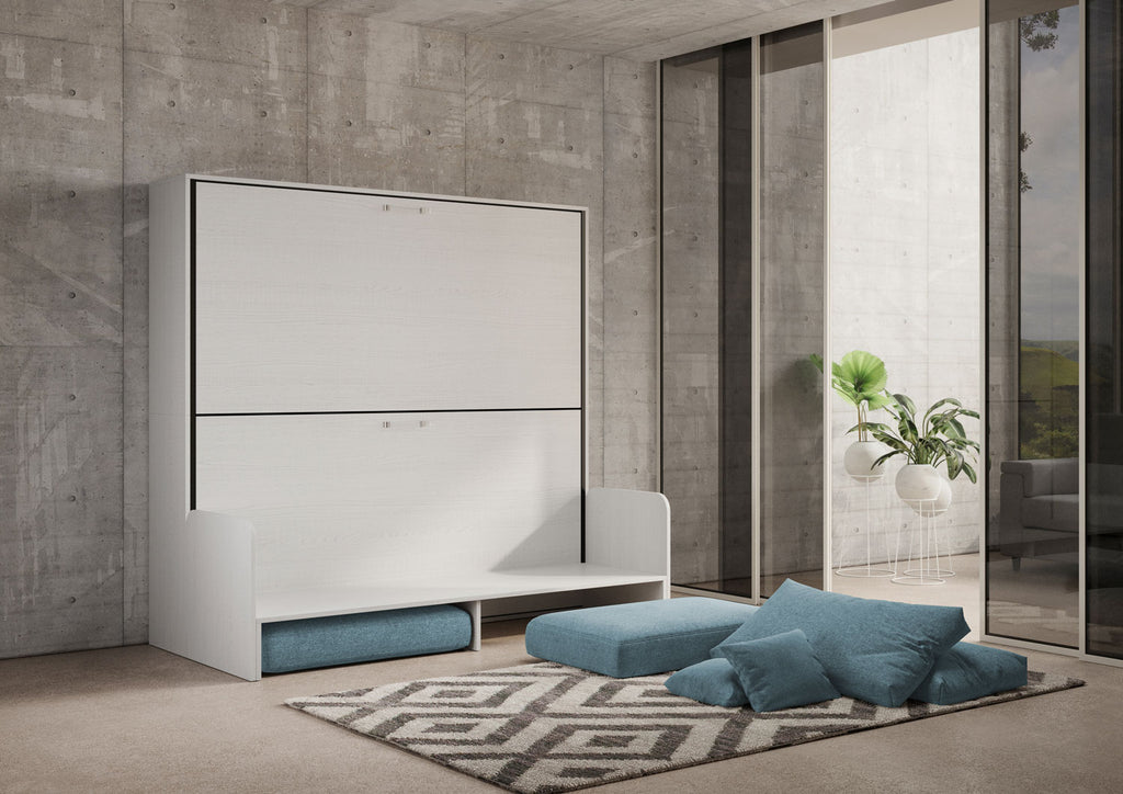 Letto Doppio A Scomparsa Kando Con Divano Con Materassi Bianco Frassino e Azzurro