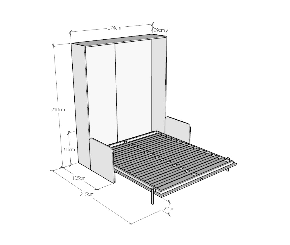 - Dimensioni: Letto chiuso: L.173,6 P.105,2 H.210,5 cm Letto aperto: L.173,6 P.215 H.210,5 cm Altezza rete da terra: 22 cm Altezza massima materasso: 24 cm