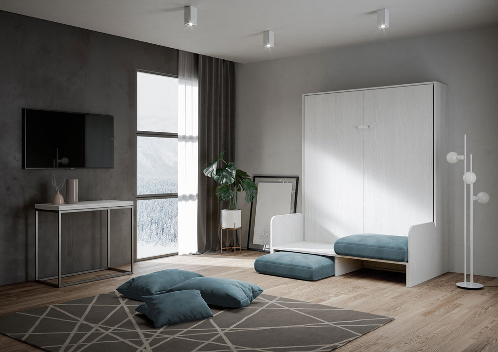 Letto Matrimoniale A Scomparsa 160 Kentaro Con Divano Bianco Frassino e Azzurro