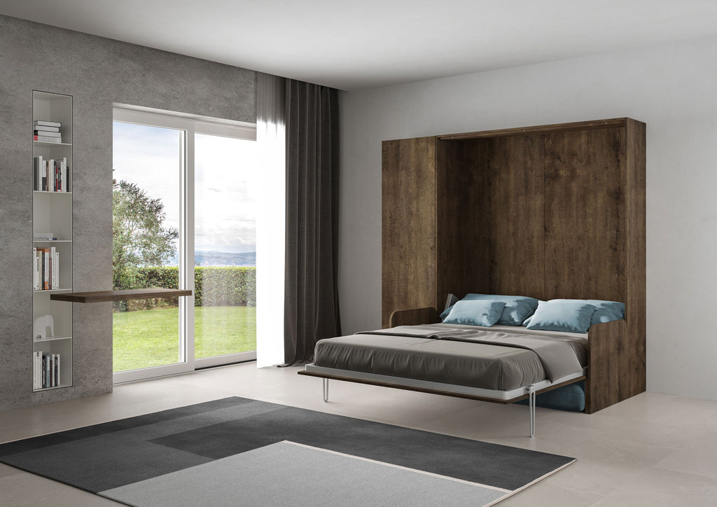 Il letto a scomparsa verticale Kentaro matrimoniale 160 rappresenta un’idea originale che, grazie alla presenza del divano, trasforma la zona giorno in zona notte in poche semplici mosse. Una soluzione perfetta per monolocali e spazi ridotti dove ogni metro quadrato è importante: questo modello smart vi permette di ottimizzare il vostro spazio, senza rinunciare alla comodità, al comfort e al design. I cuscini del divano, completamente sfoderabili, sono realizzati in microfibra. Composizione proposta con una pratica e capiente colonna, posizionabile indifferentemente sia a sinistra che a destra del letto, che permette di riporre al proprio interno tutto il necessario, per una camera da letto sempre in ordine. Colonna dotata di tre ripiani e di un appendiabiti estraibile. Anta colonna con apertura push-pull. Struttura della composizione realizzata con pannelli di particelle di legno nobilitato sp.18 mm. Struttura della rete in ferro rinforzato verniciato a polvere epossidica colore alluminio goffrato. Incluso di rete a doghe di faggio cm 163x190 con cinghie ferma materasso. La discesa del letto è assistita da pistoni a gas e agevolata dalla presenza della maniglia. Materasso non compreso. Dimensioni consigliate del materasso: L.160 P.190 H.22 cm. Portata massima letto kg 240.