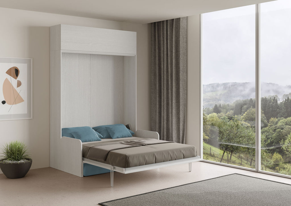 Letto Matrimoniale A Scomparsa 160 Kentaro Con Divano E Pensile Bianco Frassino e Azzurro