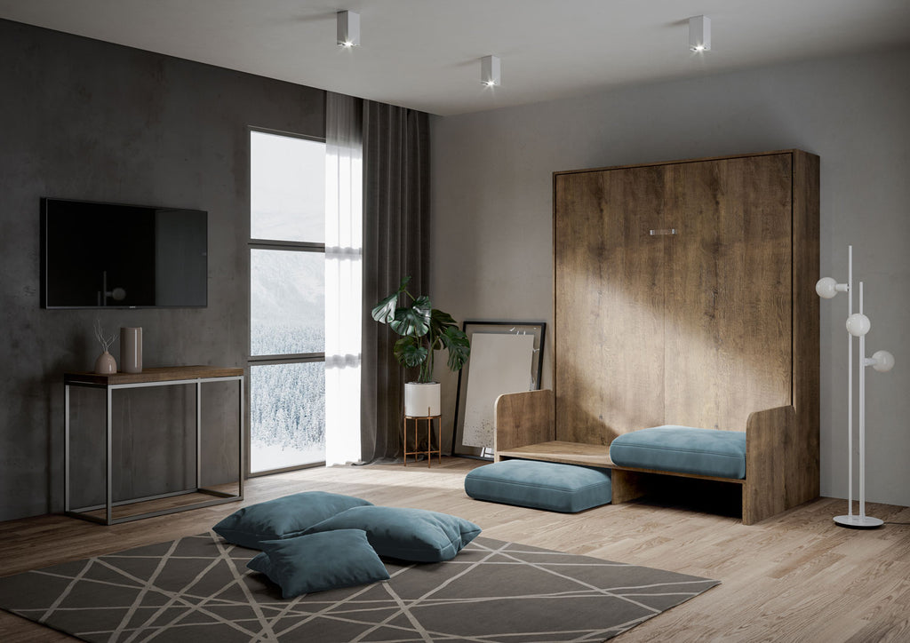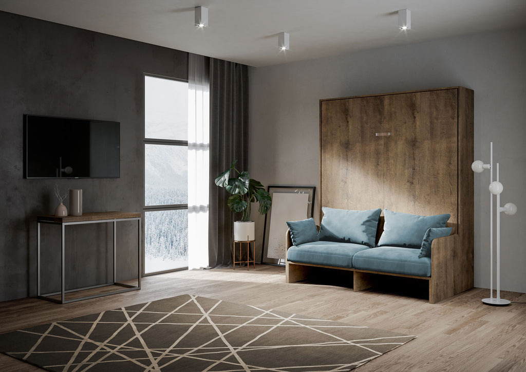 Letto Matrimoniale A Scomparsa 160 Kentaro Con Divano Noce e Azzurro