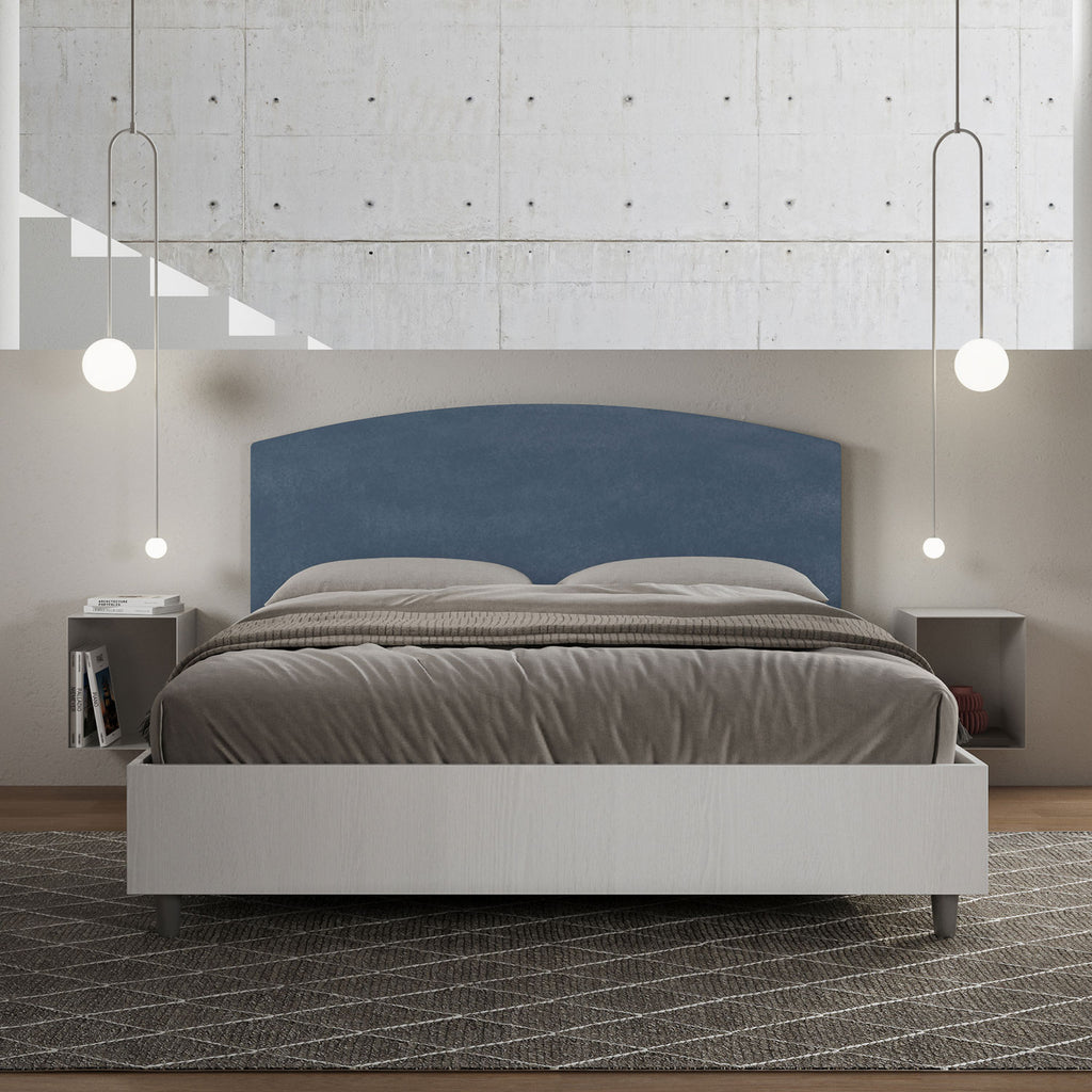 Letto Matrimoniale con Rete e Contenitore Alzata Comoda Struttura Bianco Frassico e Testata in Microfibra Antilia Blu Varie Misure