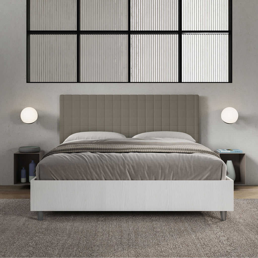 Letto Matrimoniale con Rete e Contenitore Alzata Comoda Struttura Bianco Frassico e Testata in Similpelle Burmy Cappuccino Varie Misure