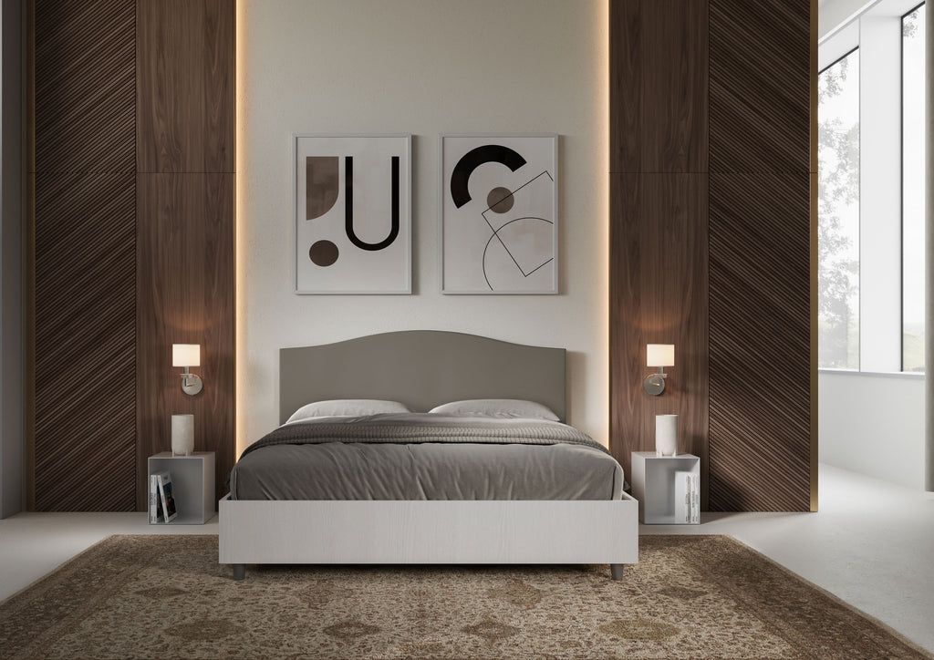 Letto matrimoniale in varie misure Grace con testata e Letto in pannelli di nobilitato, con copritestata rivestito in similpelle, particolarmente versatile e facilmente abbinabile a qualsiasi stile di arredamento. Il letto matrimoniale Grace è caratterizzato da uno stile minimal e versatile grazie alle superfici semplici e lineari tipiche del legno e al copritestata in similpelle. La testata con copertura in similpelle, insieme alle proprietà del legno, conferirà alla vostra stanza un ambiente caldo ed accogliente. Letto fornito con rete contenitore con doppia alzata. Materasso non incluso. Rivestimento testiera sfoderabile.