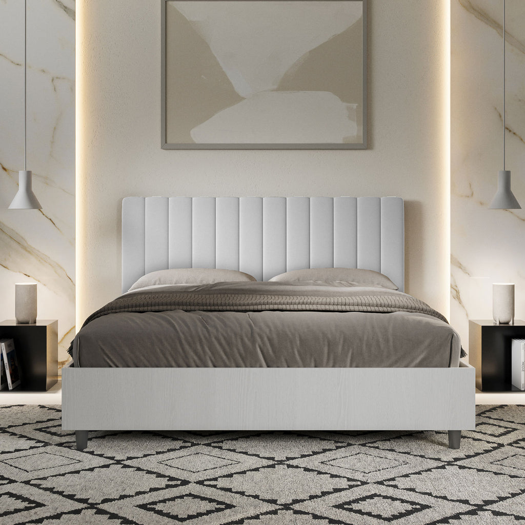 Letto Matrimoniale con Rete e Contenitore Alzata Comoda Struttura Bianco Frassico e Testata in Similpelle Kaia Bianco Varie Misure