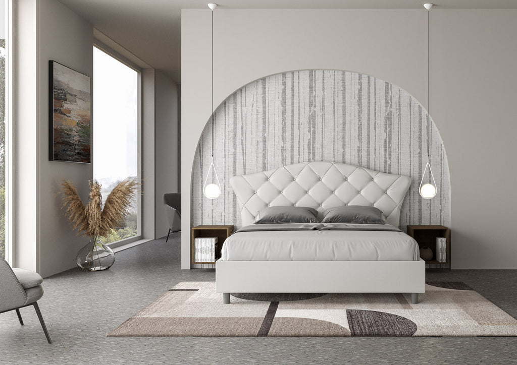 Letto matrimoniale modello Langre con giroletto imbottito. Rivestito interamente in similpelle di colore bianco. La struttura presenta una grande testata sagomata, dall’apparente forma classica rivisitata in chiave moderna, impreziosita da bottoni lungo tutta la superficie a formare un effetto trapuntato e imbottito. Langre è il modello ideale, capace di trasmettere comfort ed accoglienza a 360°. Letto fornito con rete contenitore, predisposto per materasso L.160 P.200