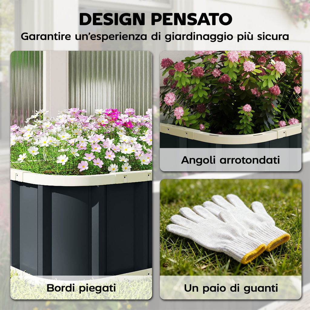 Migliora il tuo spazio di coltivazione all'aperto con il letto per orto rialzato da giardino. I bordi lisci e piegati rendono il giardinaggio più sicuro e semplice per tutta la famiglia. Il montaggio senza utensili ti fa risparmiare tempo per goderti i tuoi momenti di giardinaggio. I pannelli in acciaio rinforzato garantiscono una stabilità duratura, mentre il design aperto sul fondo migliora il drenaggio e l'accesso al terreno!