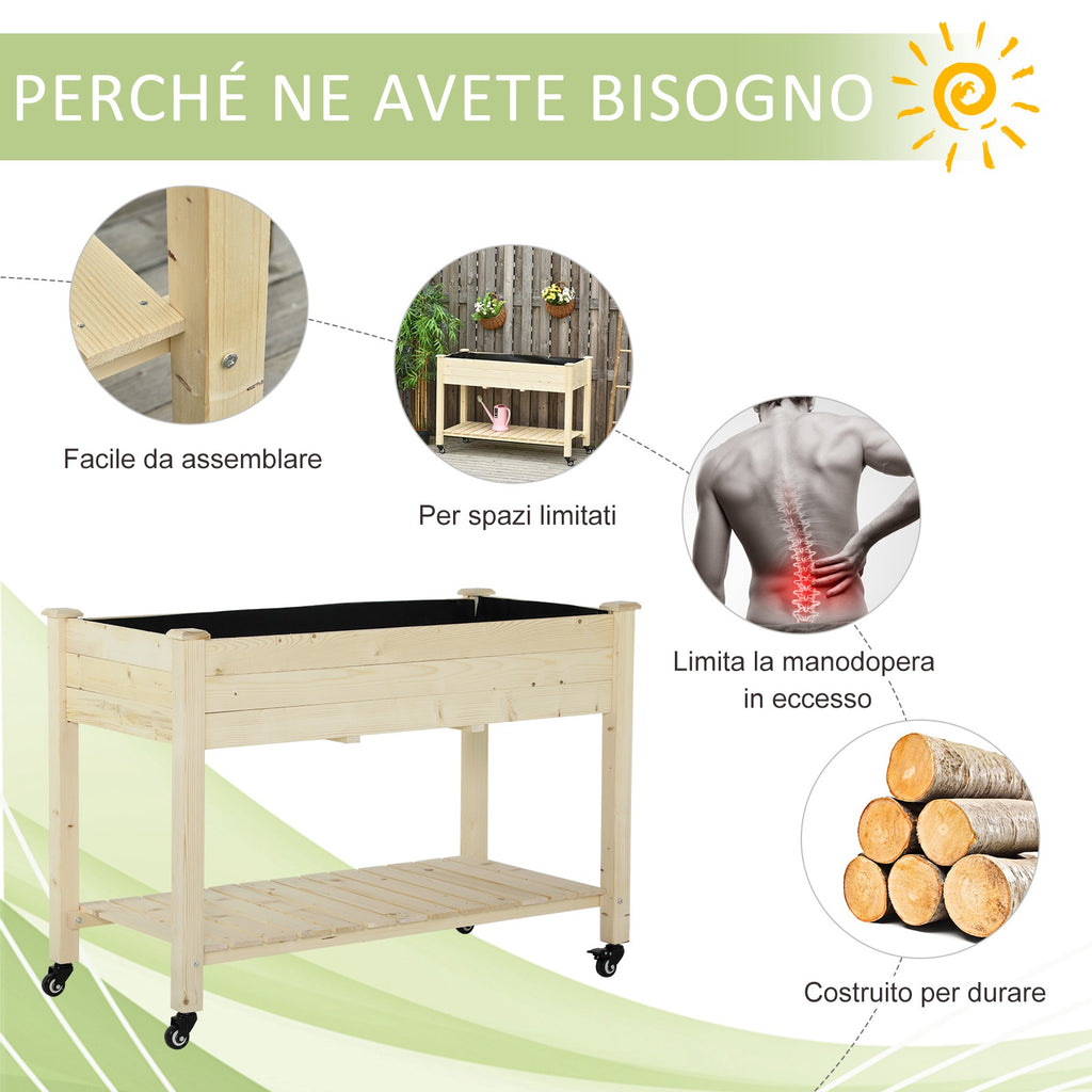 Letto per Orto Rialzato in Legno con Rotelle e Ripiano Inferiore 118x55x83 cm Legno Naturale