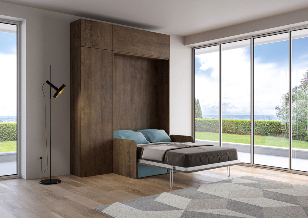 Letto Una Piazza E Mezzo A Scomparsa 120 Kentaro Con Divano E Mobili Noce e Azzurro
