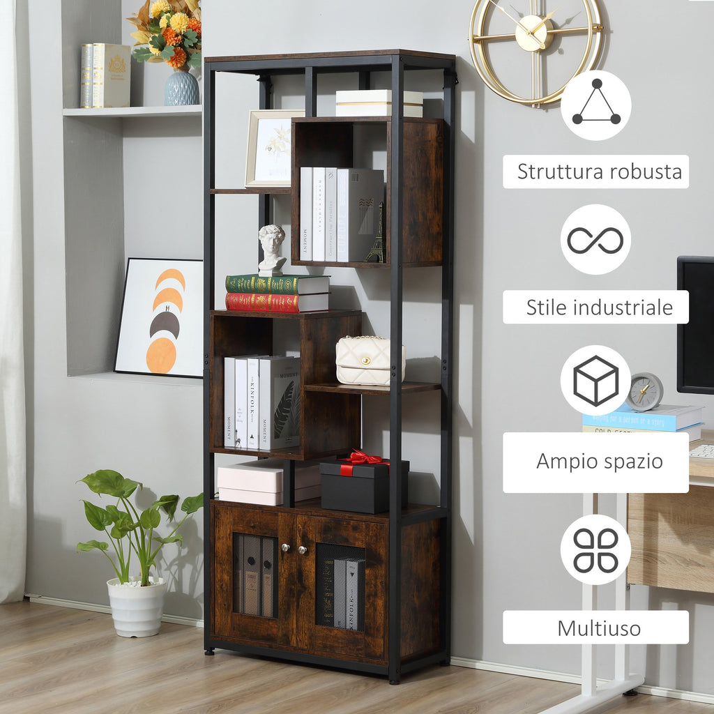 Libreria 8 Ripiani 2 Ante 70x30x180 cm in Legno Truciolare e Metallo Marrone
