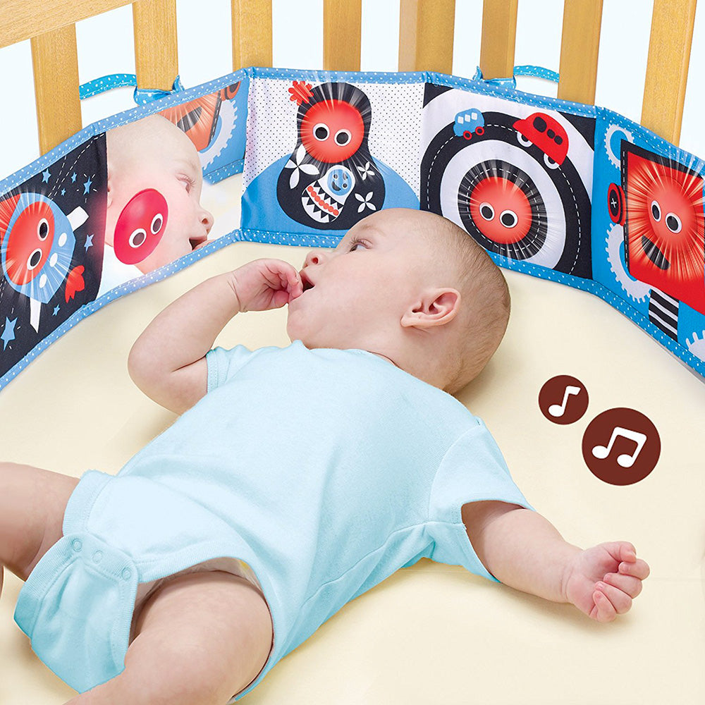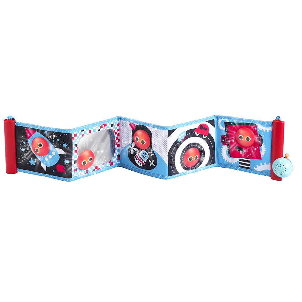 Questo soffice libro con apertura a fisarmonica e luci svolge un'azione calmante e stimolante al tempo stesso grazie alle 10 faccine sorridenti che si illuminano. Sulle due facce del libro temi diversi con immagini semplici da un lato e più elaborate dall'altro per supportare stadi di crescita e stimolazioni visive diverse (i disegni richiamano le 4 stagioni). Riproduce 2 temi musicali di musica classica (Chopin e Haydn) di 10 minuti ciascuno. Funziona con 3 batterie tipo AAA non incluse. Modalità silenziosa per un gioco più tranquillo. Consistenze diverse per lo sviluppo tattile e specchio sicuro per il bimbo, usabile in carrozzina, sul passegino, sul lettino o sul pavimento. Sviluppa i muscoli di testa e spalle, rafforza il focus visivo.