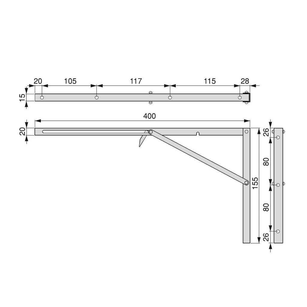 Set di 4 staffe pieghevoli per posizionare le mensole a parete. Disponibile nelle misure da 200 mm/300 mm/400 mm con una capacità di carico massima di 40, 50 o 60 kg per ogni ripiano con due staffe.