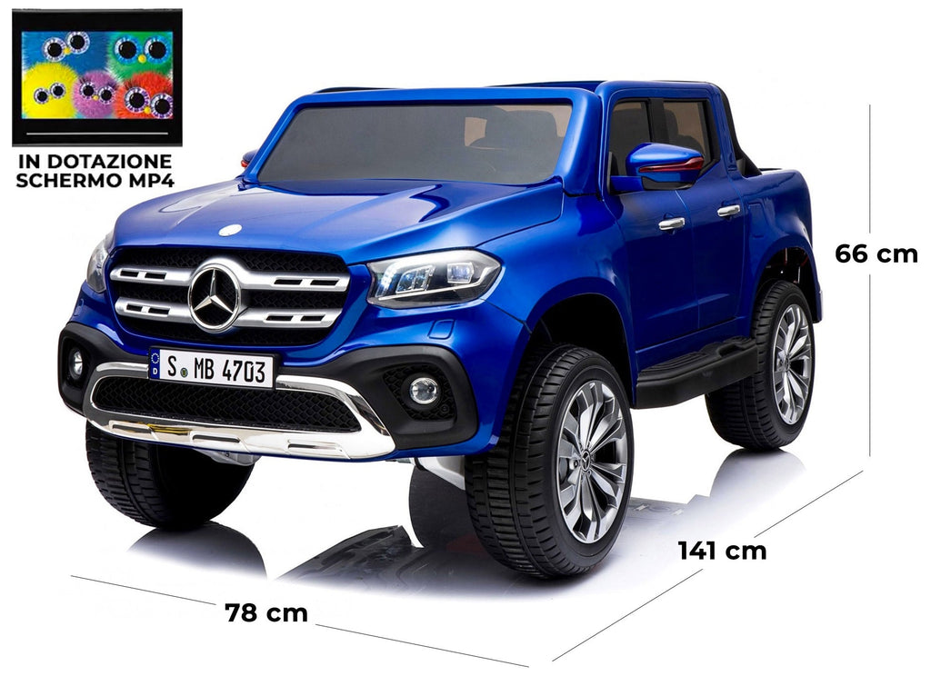Macchina Elettrica Pick-Up Mercedes Classe X Full Optional. Auto di altissima qualità dotata di sospensioni reali. Massima sicurezza in quanto è dotata di telecomando a distanza per il controllo parentale da parte dei genitori, questa macchina elettrica è ricca di optional come il lettore Mp3 con cassa stereo, luci, un ingresso usb e un display Mp4.