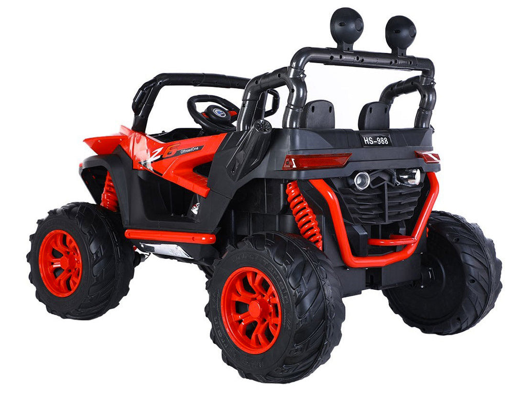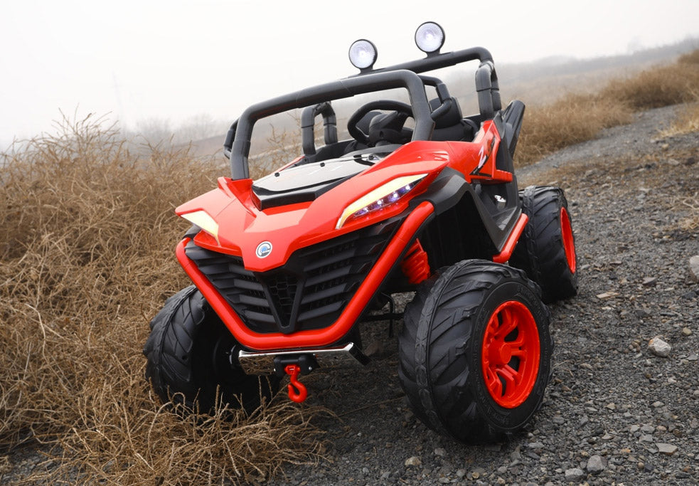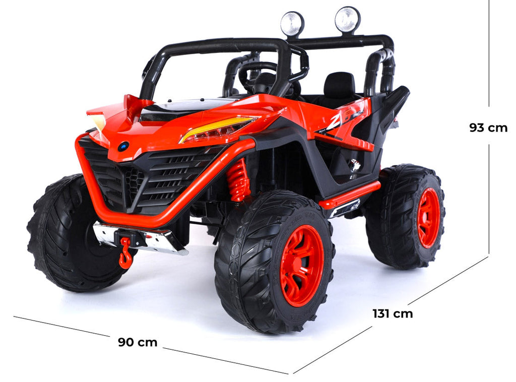 Per vivere un'avventura senza tempo, la macchina telecomandata è dotata di quattro grandi ruote in plastica con parte centrale in gomma e seduta ergonomica, faretti LED sulla barra anteriore e sospensioni per adattarsi a ogni pavimentazione.