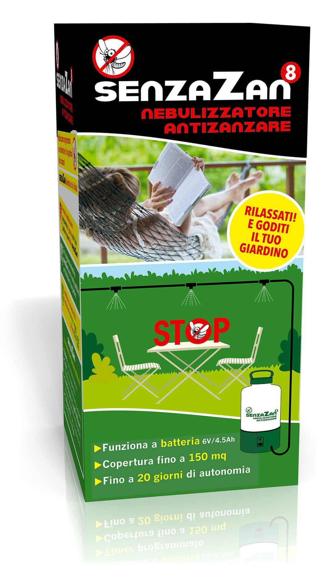 3 minuti di nebulizzazione di prodotto abbattente o disabituante al giorno sono sufficienti per liberare un'area di circa 150 mq per 6 - 8 ore al giorno. SenzaZan effettuerà una nuova accensione, per un programma di mantenimento, 12 ore dopo la prima accensione. Distribuisci il tubo lungo il perimetro verde del giardino o vicino alla zona da difendere dagli insetti. Gli ugelli nebulizzeranno il principio attivo, appositamente studiato per difendere l'area dalle zanzare ed altri insetti molesti. Si suggerisce di effettuare la prima accensione la sera, quando le zanzare sono maggiormente presenti, 12 ore dopo, quindi la mattina SenzaZan effetturà il secondo ciclo di 3 minuti in autonomia. Durante le ore più calde è sconsigliato l'utilizzo, in quanto sarebbe meno efficace.SenzaZan suggerisce l'uso di prodotti naturali per un programma di mantenimento senza zanzare. Le nebulizzazioni programmate, con prodotti naturali, creano un ambiente sgradito agli insetti. Chiedi suggerimento al rivenditore, saprà indicarti in prodotto più idoneo da utilizzare! La batteria e la riserva di 8 lt ti offrono un'autonomia di circa 20 gg.