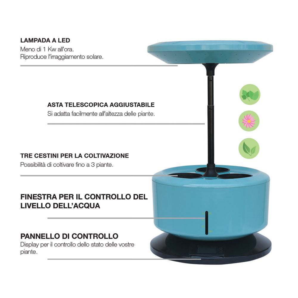 Dedicata agli appassionati della coltivazione idroponica, funziona ad energia elettrica con un consumo giornaliero minimo e grazie alla vasca interna, permette alle piante di avere un costante ricircolo d'acqua.